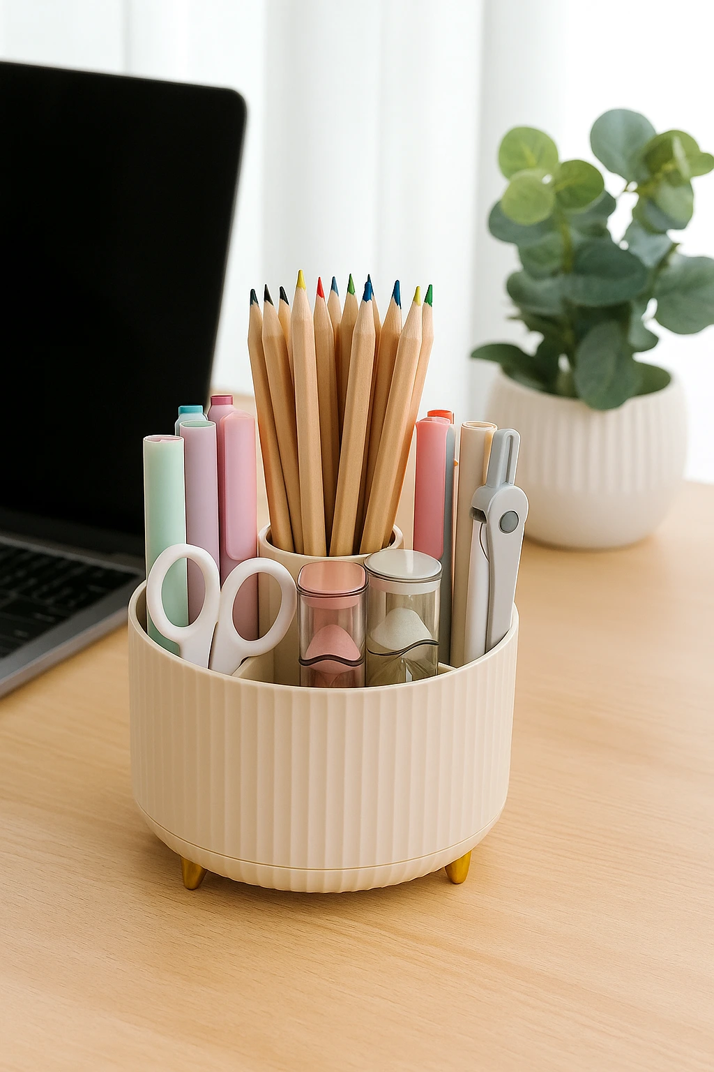 The 360° rotating base ensures smooth access to all your stationery, art supplies, or even makeup brushes — no more searching for missing pens or tools. Its polished beige finish adds a clean, modern look that blends seamlessly with any decor.