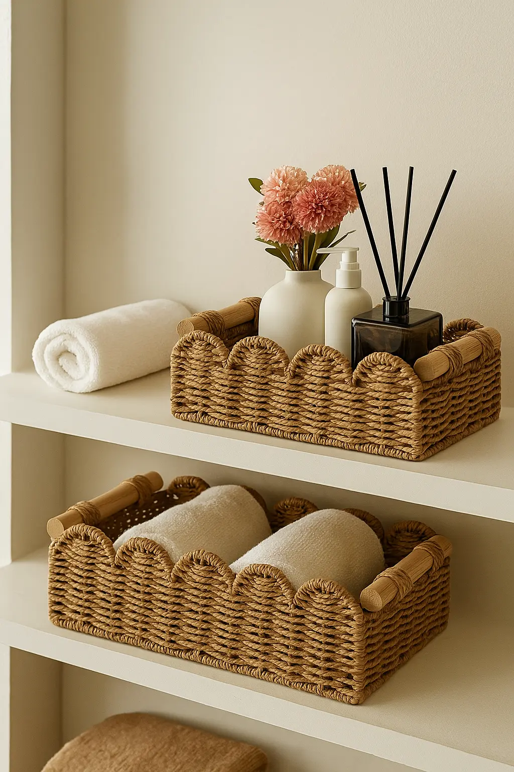 Whether you’re organizing your bathroom essentials, bedroom accessories, or living room shelves, these baskets bring texture, warmth, and personality to your space. The neutral tone complements any interior style—from boho to minimalist—and the two wooden handles ensure easy and convenient carrying.