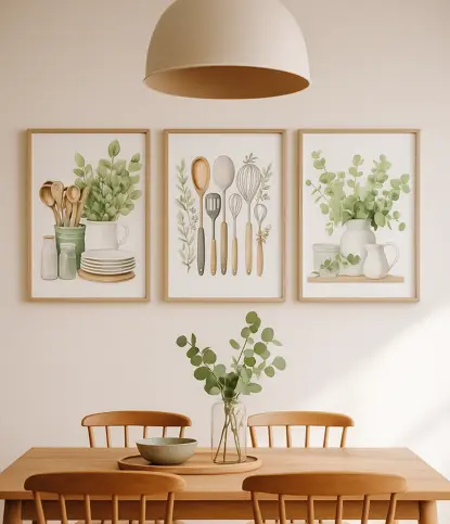 Transform your living space with the 3 Pcs Sage Green Farmhouse Kitchen Canvas Wall Art, a perfect blend of simplicity, nature, and modern style. Each piece showcases eucalyptus leaves in calming sage green tones, ideal for creating a peaceful and inviting atmosphere.